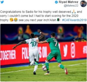 واعتذررياض عن عدم حضوره حفل تتويج ماني قائلا: “آسف لعدم تمكني من الحضور،