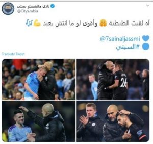 مان سيتى ، نشر عبر حسابه بموقع تويتر صورا للمدير الفنى بيب جوارديولا أثناء احتضان