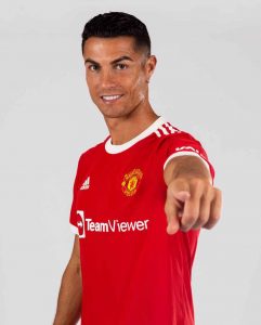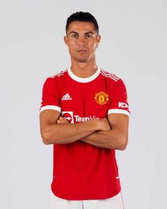 الماضي، كريستيانو رونالدو يرتدي طقم مانشستر يونايتد الجديد لعام 2021/22”.