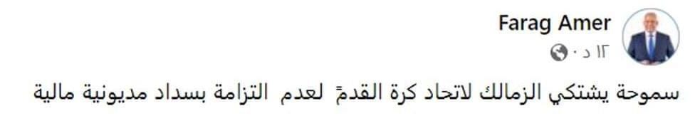 أعلن فرج عامر رئيس مجلس إدارة نادي سموحة عبر صفحته منذ أيام قائلا: “سموحة يشتكي الزمالك لاتحاد كرة القدم لعدم التزامه بسداد مديونية مالية” إلا أن رئيس النادي السكندري لم يذكر سبب الشكوى قبل أن بحذف المنشور لاحقا.