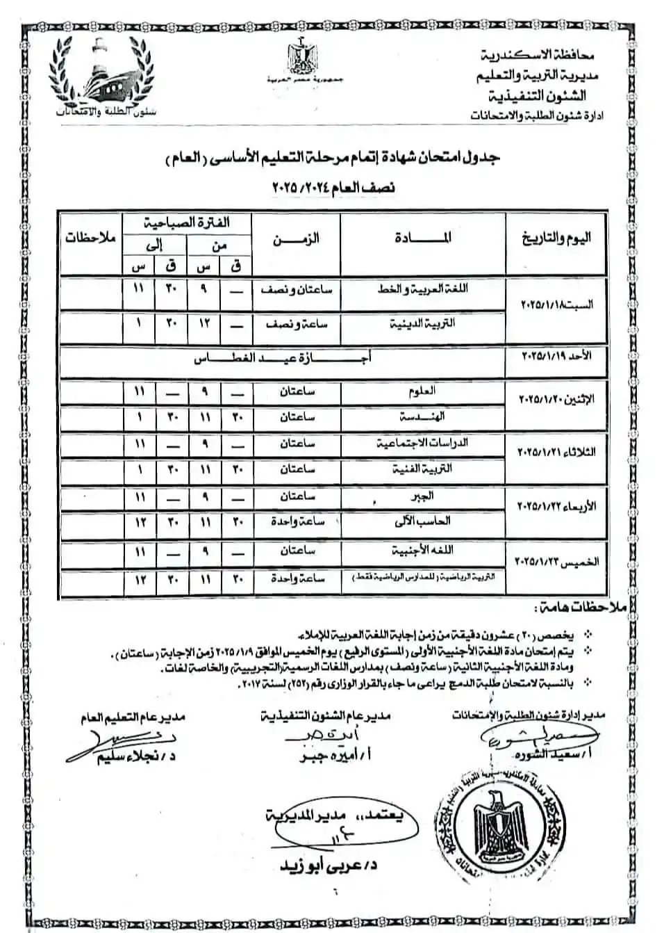 جدول امتحانات الشهادة الاعدادية محافظة الاسكندرية