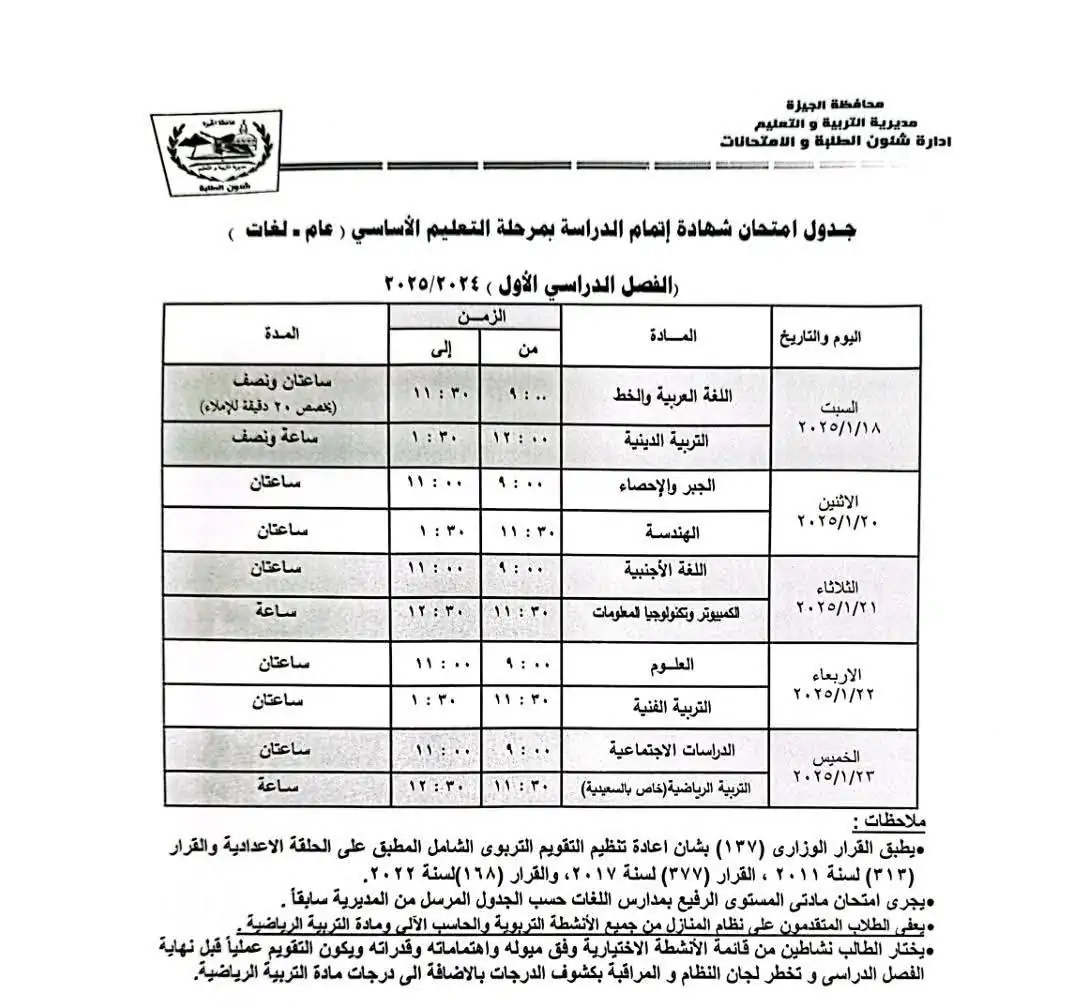 جدول امتحانات الصف الثالث الاعدادي محافظة الجيزة