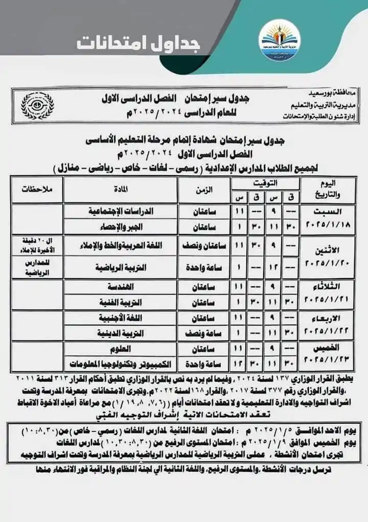 جدول امتحانات الصف الثالث الاعدادي محافظة بورسعيد