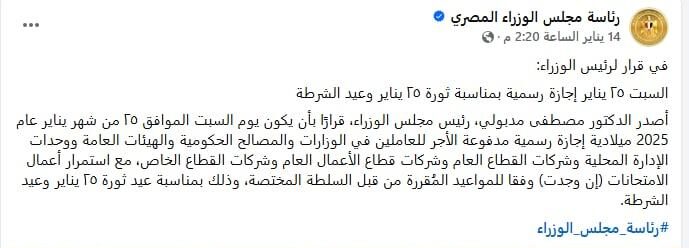 - موعد إجازة عيد الشرطة وثورة 25 يناير يوم السبت الموافق 25 يناير 2025.