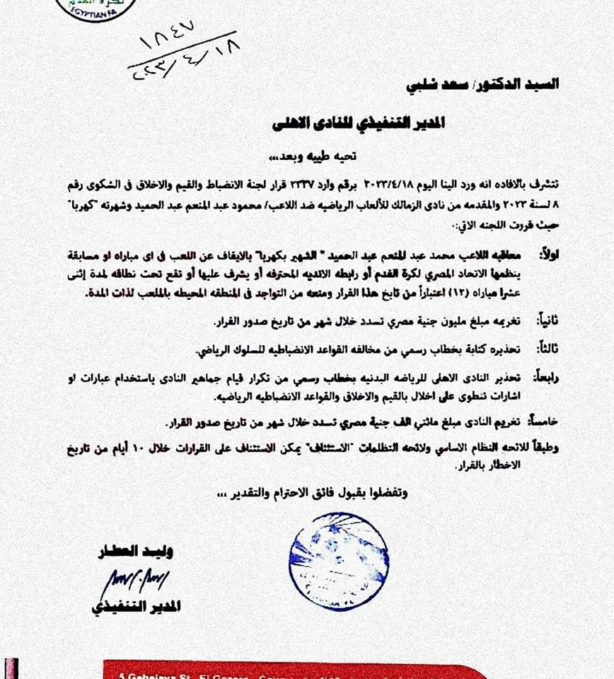 معاقبة اللاعب محمود عبد المنعم عبد الحميد، الشهير بكهربا، بالإيقاف عن اللعب في أي مباراة أو مسابقة ينظمها الاتحاد المصري لكرة القدم، أو رابطة الأندية المحترفة، أو يشرف عليها أو تقع تحت نطاقه لمدة اثنتي عشرة مباراة، اعتبارًا من تاريخ هذا القرار، ومنعه من التواجد في المنطقة المحيطة بالملعب لذات المدة.