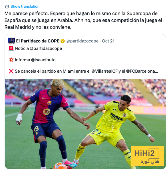 هذا الحساب الموجود في اعلى الصفحة هو لشخص اسباني مجهول الهوية ولكن المؤكد هو من اهل الشأن نفسه اي من اصحاب الجنسيه الاسبانيه يقول فيه ” يبدو ان القرار مثالي ولكن يجب ان يفعلوا الشيء نفسه مع كأس السوبر في السعودية ، ولكن يبدو انهم لا يستطيعون فعل ذلك لان ريال مدريد متواجد في تلك المسابقة ” . هو يعلق على قرار الغاء جولة برشلونة وفياريال في ميامي .